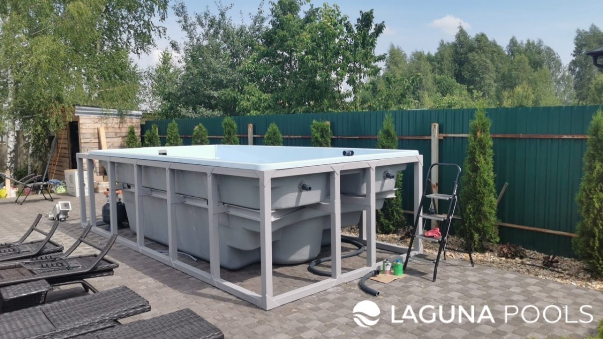 Установка композитного бассейна на металлическом каркасе на открытом воздухе