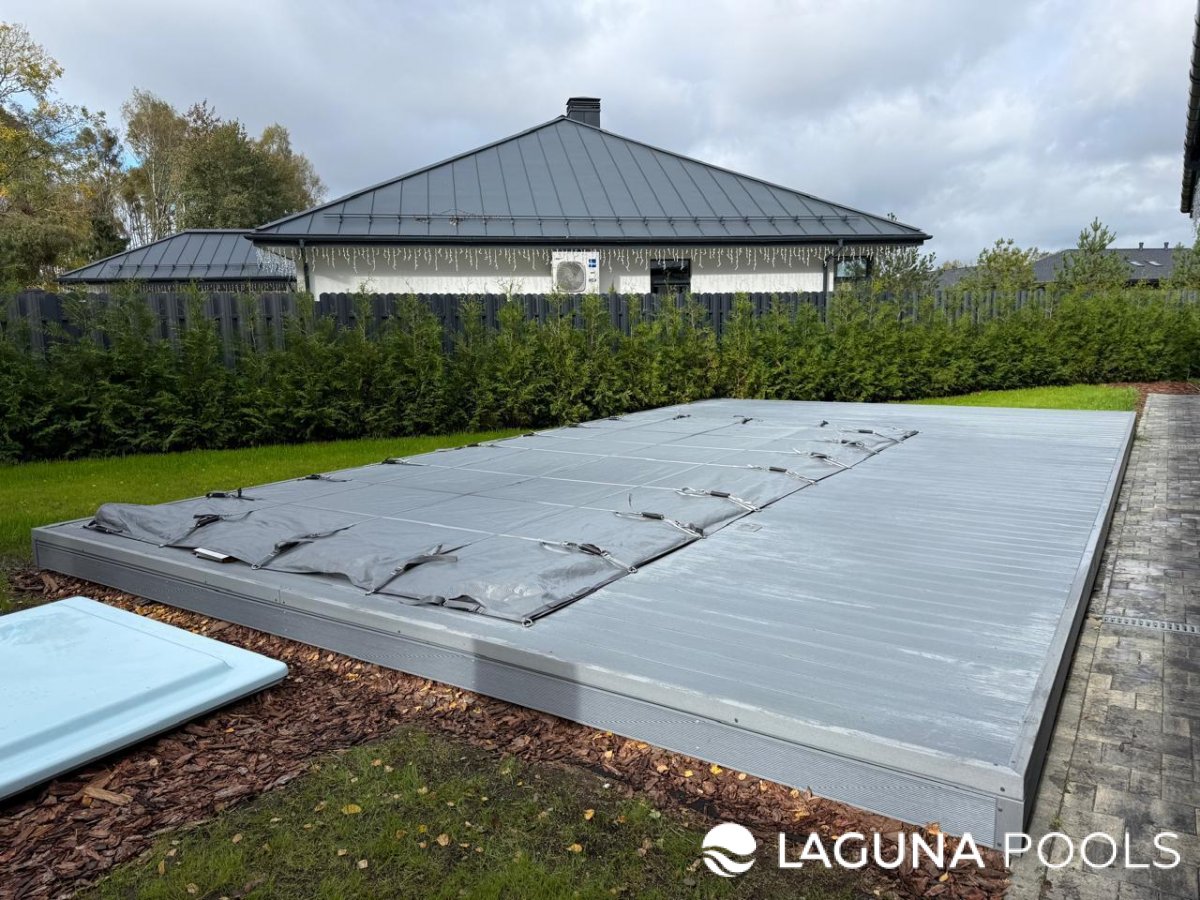 Уличный бассейн с защитным покрытием среди террасной доски и живой изгороди