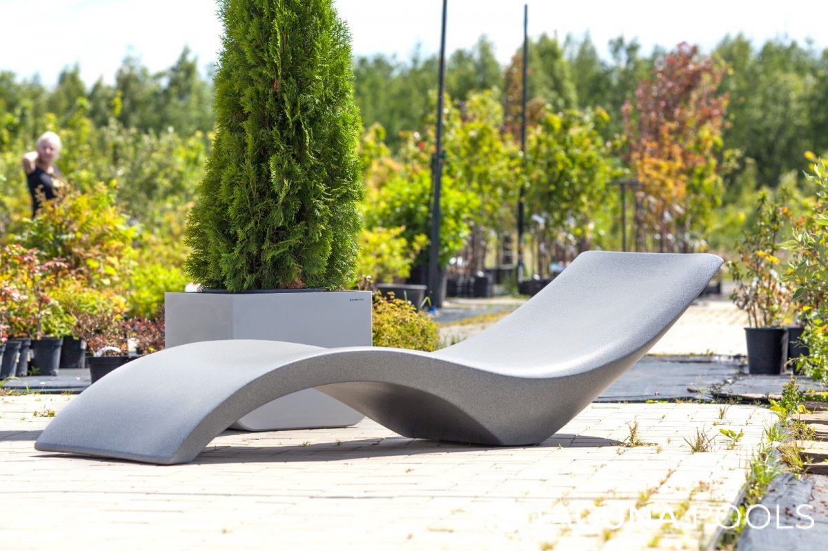 Серый шезлонг эргономичной формы на деревянном настиле с зелёными растениями